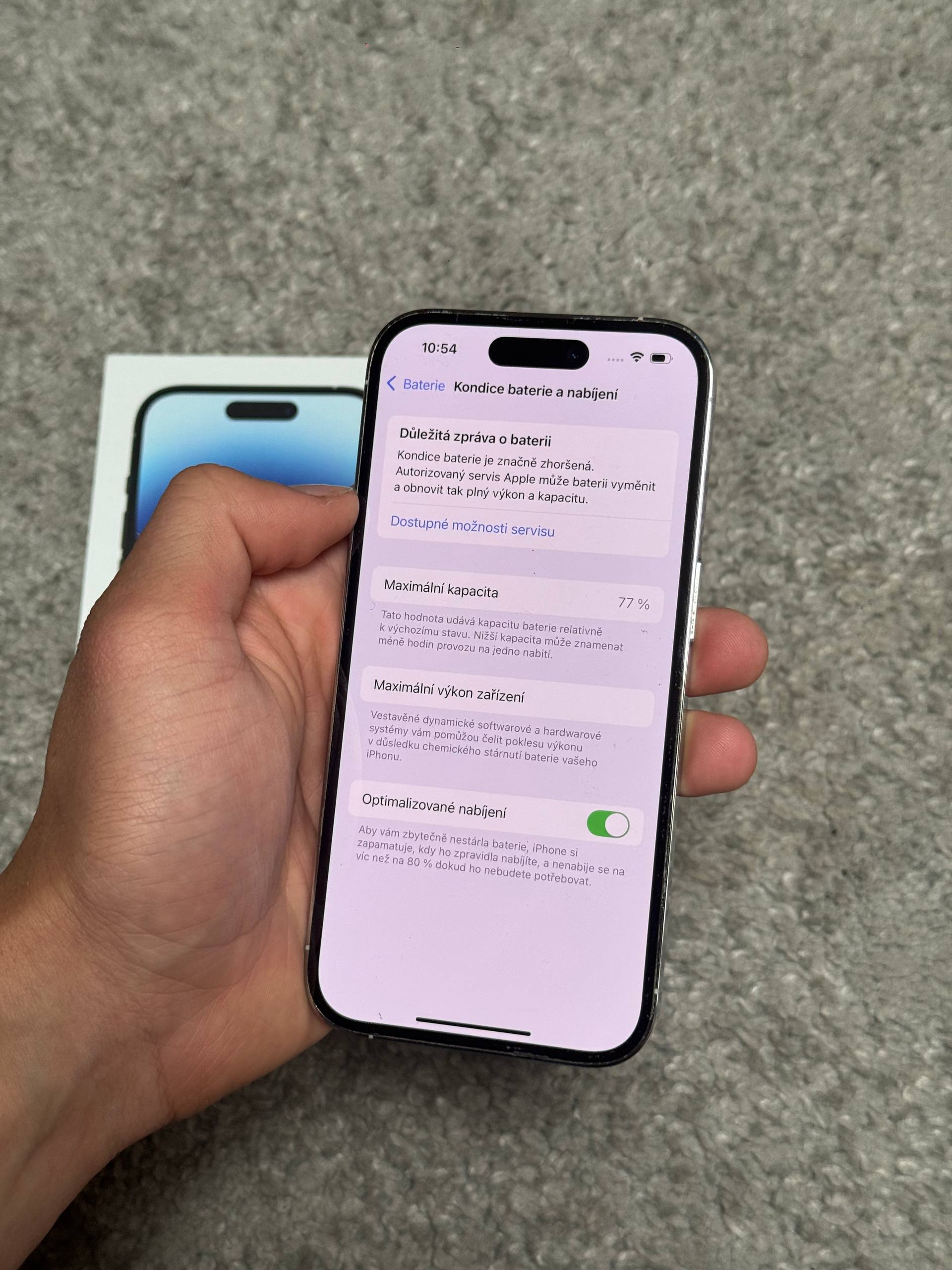 🔋 Baterie – 77% drží výborně, telefon je připravený k okamžitému používání